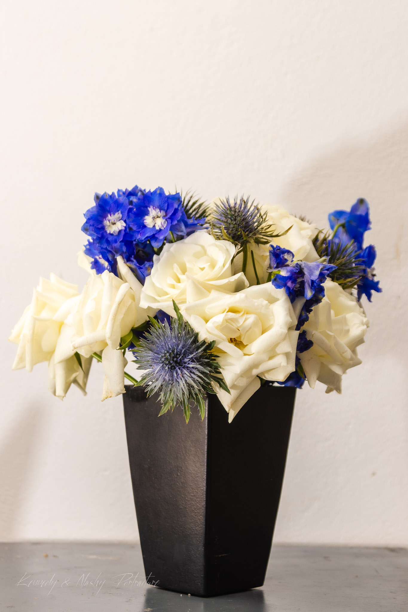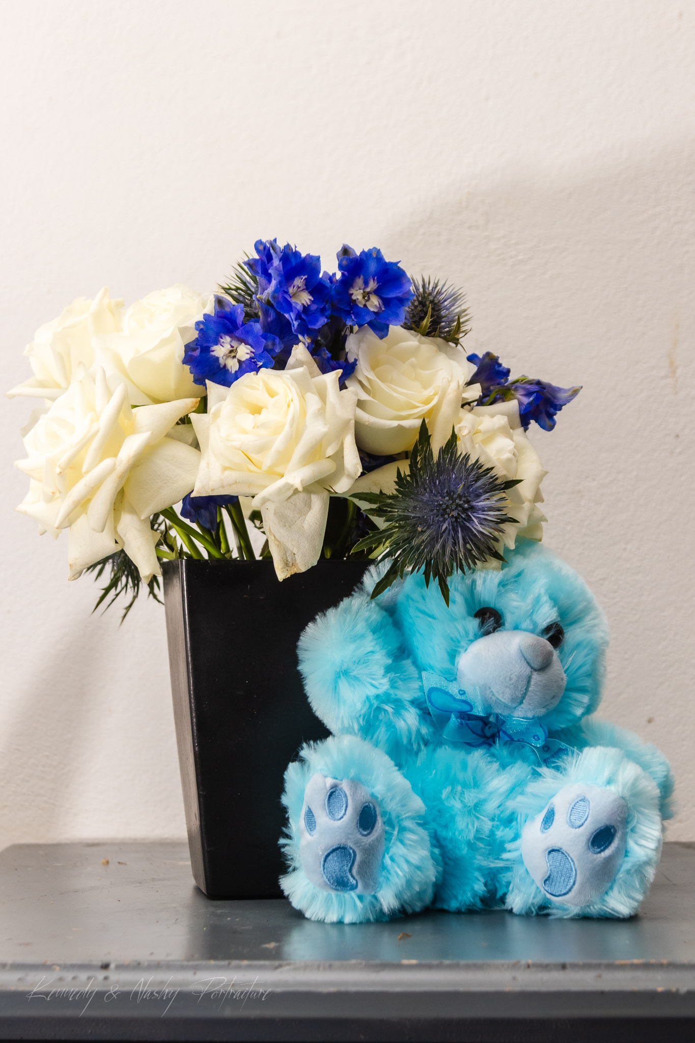 A calming blend of white roses, blue delphiniums, and spiky sea-hued thistles beautifully arranged in a modern black vase — paired with a plush sky-blue teddy for that extra touch of affection. This arrangement is a perfect way to say thank you, I miss you, or I care.