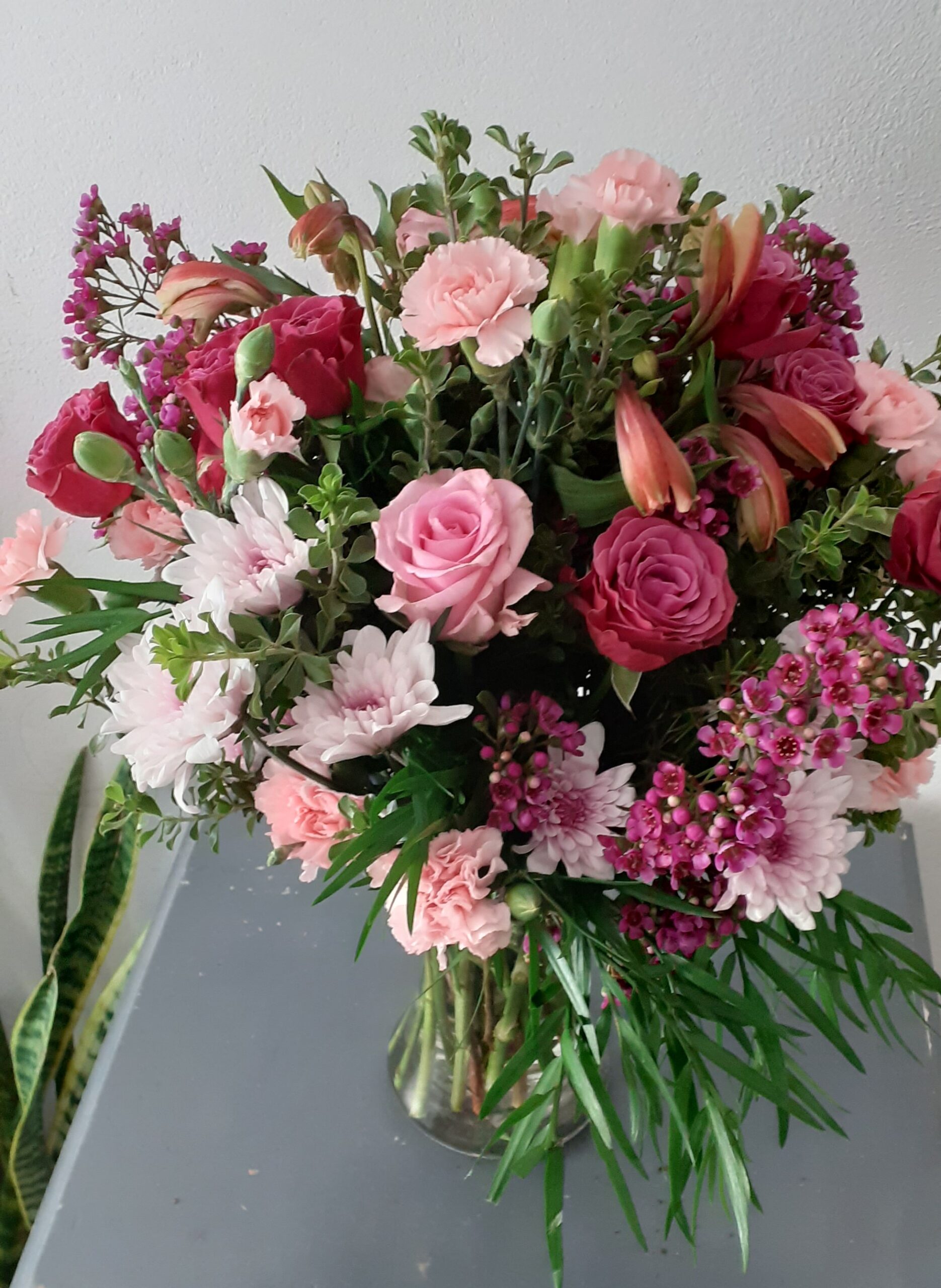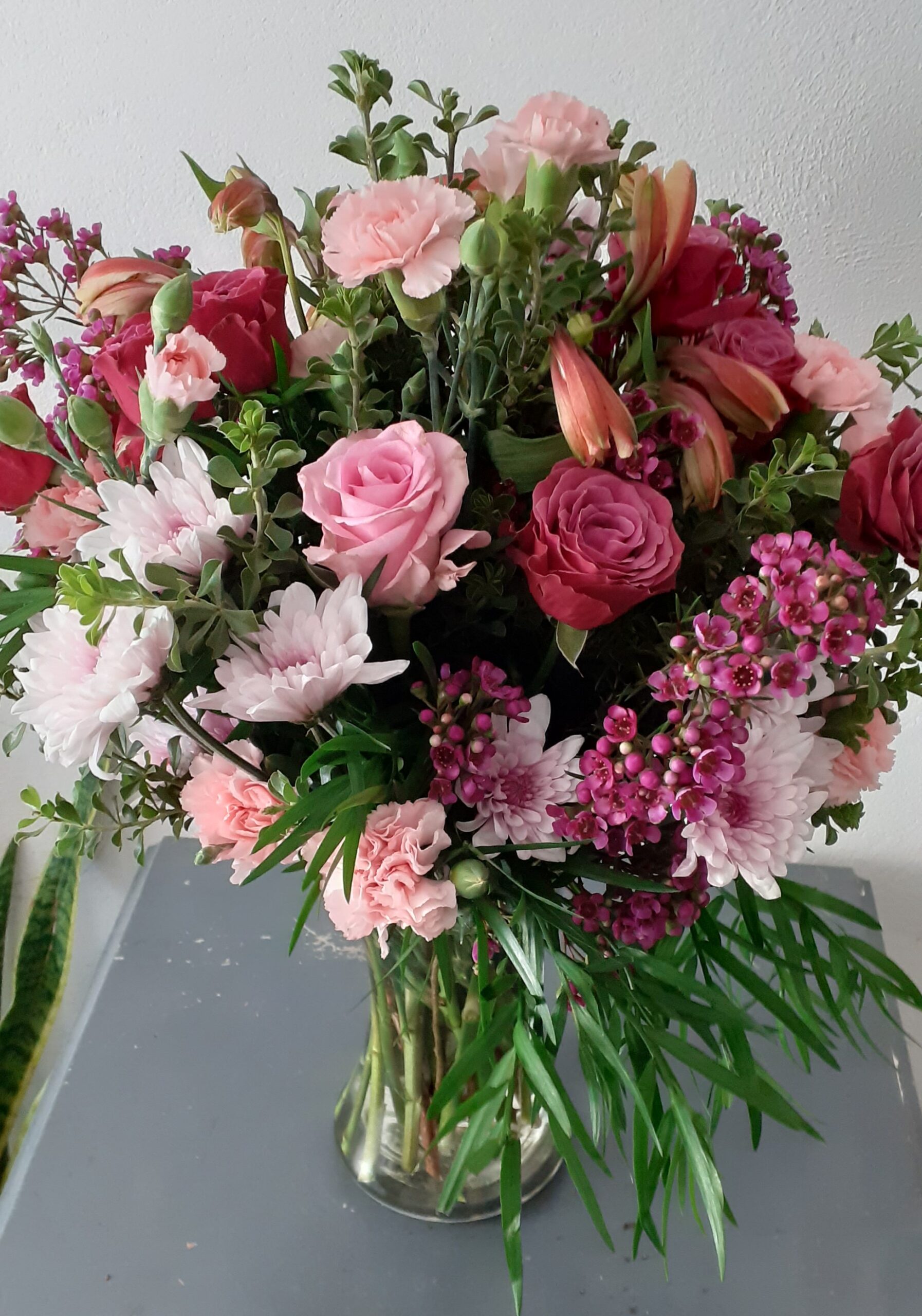 A graceful arrangement featuring a harmonious blend of dark and light pink roses, carnations, alstroemeria, and lush greenery. Perfect for any occasion, this vase of vibrant blooms captures the beauty of soft elegance with a touch of charm.