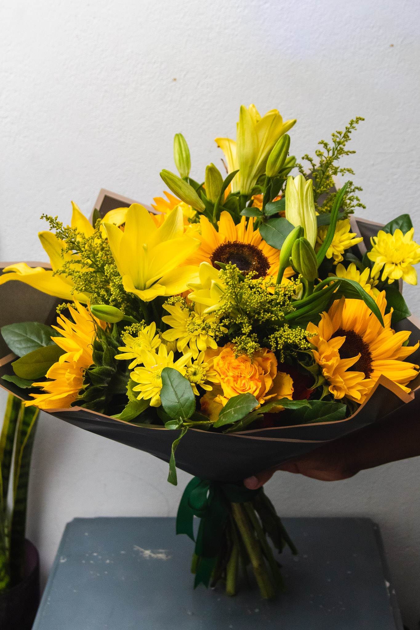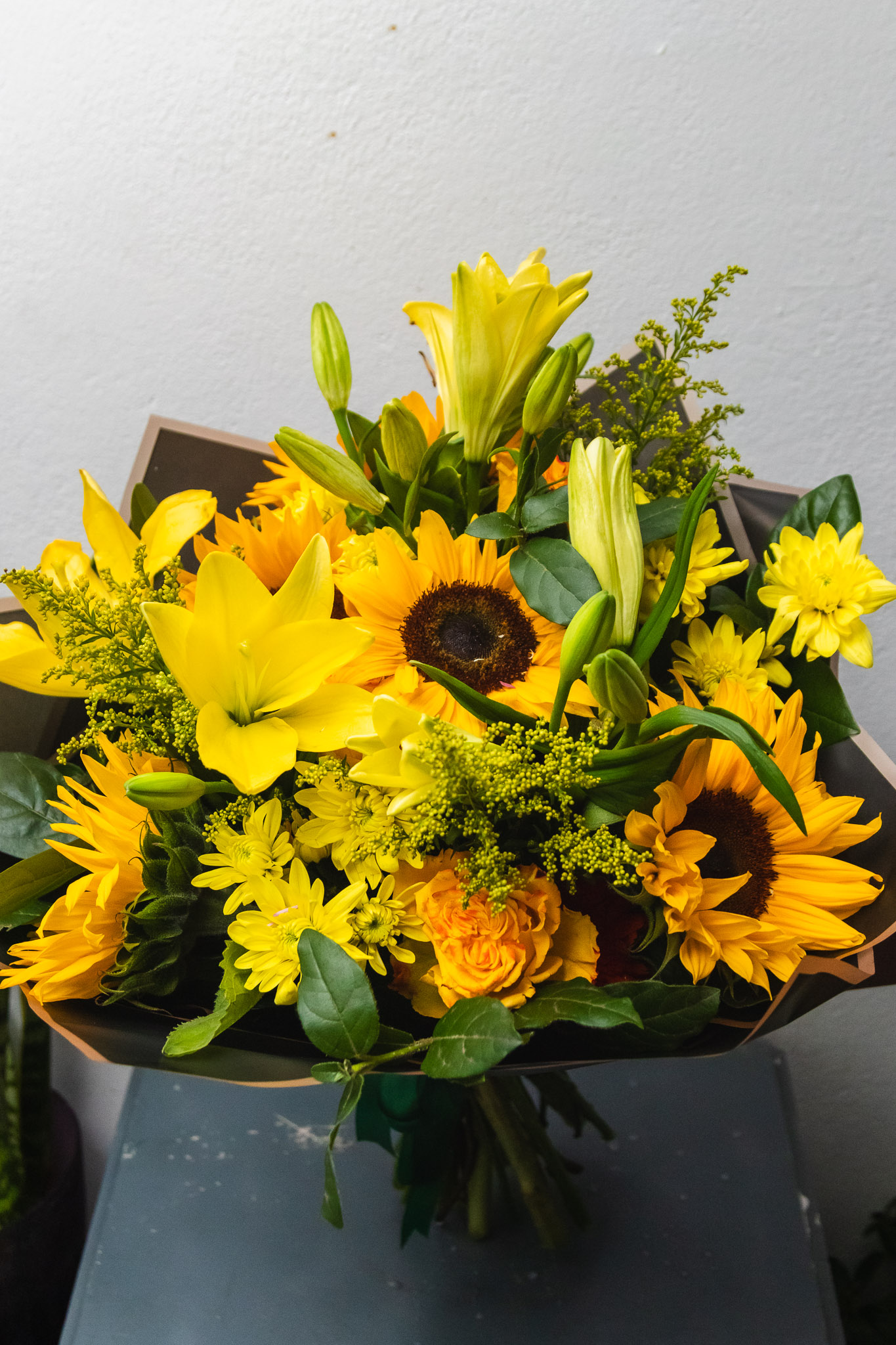 Bright, bold, and full of joy, this sunny bouquet is the perfect pick-me-up for any occasion. Bursting with vibrant yellow lilies, golden sunflowers, chrysanthemums, solidago, and lush greenery, it radiates warmth and happiness in every bloom.