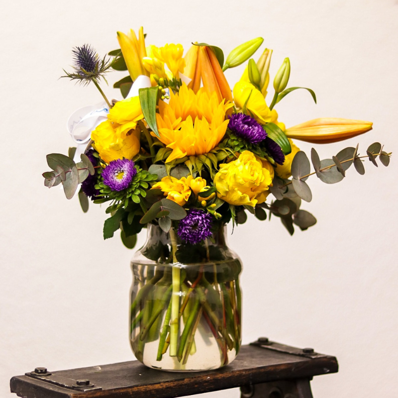 Brighten any space with our "Celebrations" arrangement, featuring vibrant yellow and purple blooms. Available in multiple sizes, it suits any occasion. Handcrafted for elegance, it adds sophistication to any setting. Perfect for birthdays, anniversaries, or any joyous event. Please note, exact flowers may vary based on availability and season.