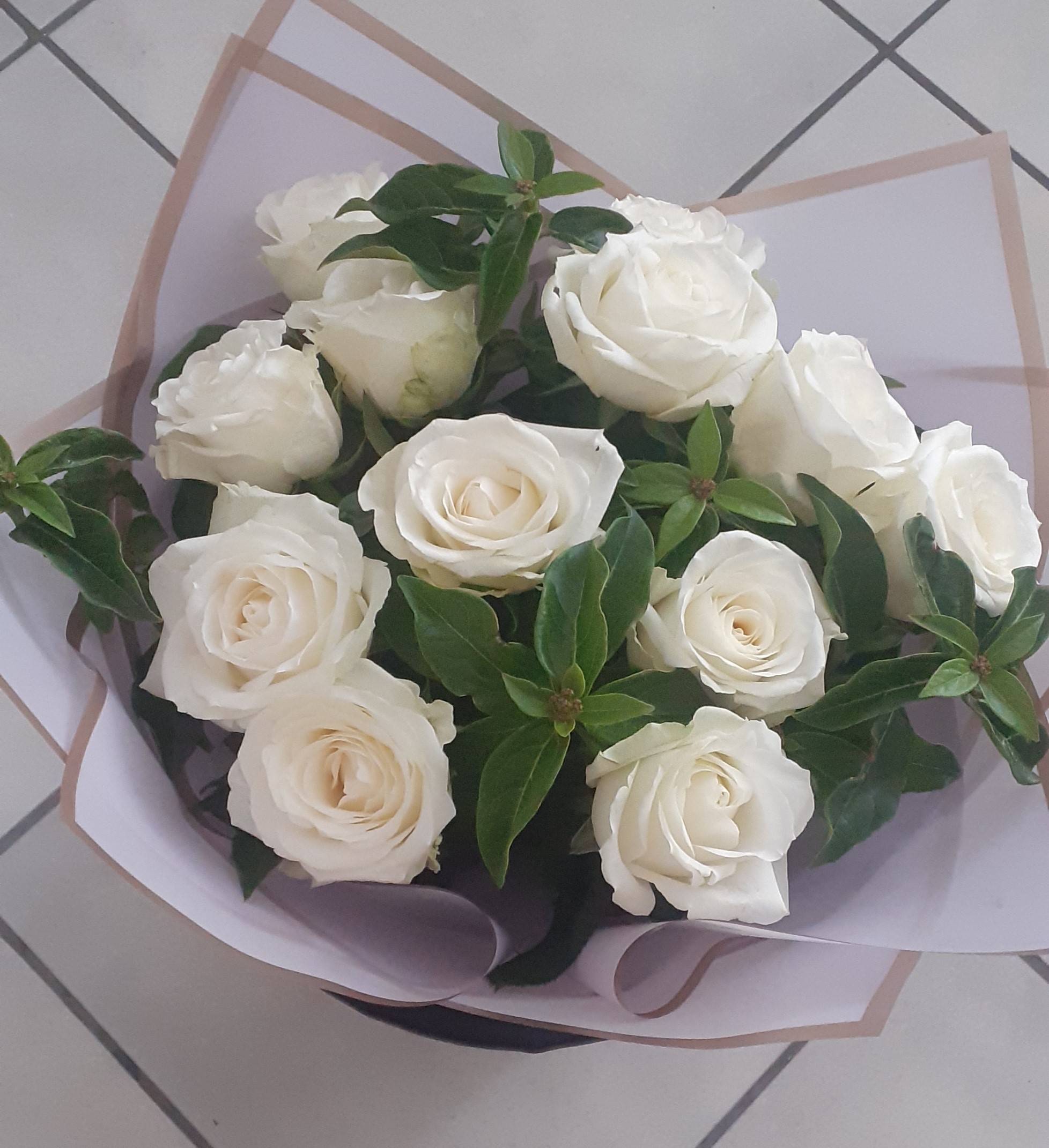 A refined bouquet of 12 white roses paired with delicate greenery, creating a timeless display of purity and elegance. Perfect for conveying admiration and grace in any setting.