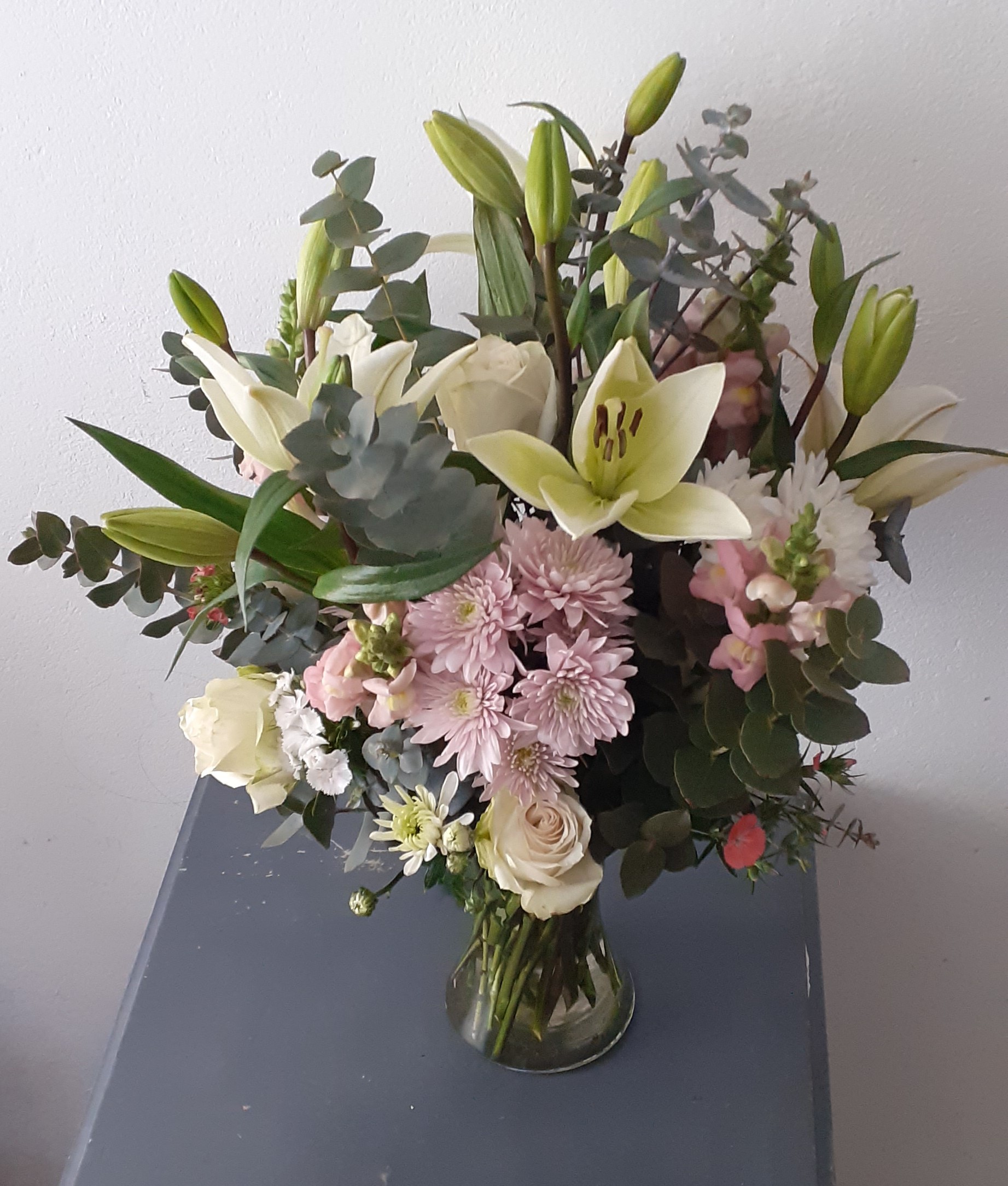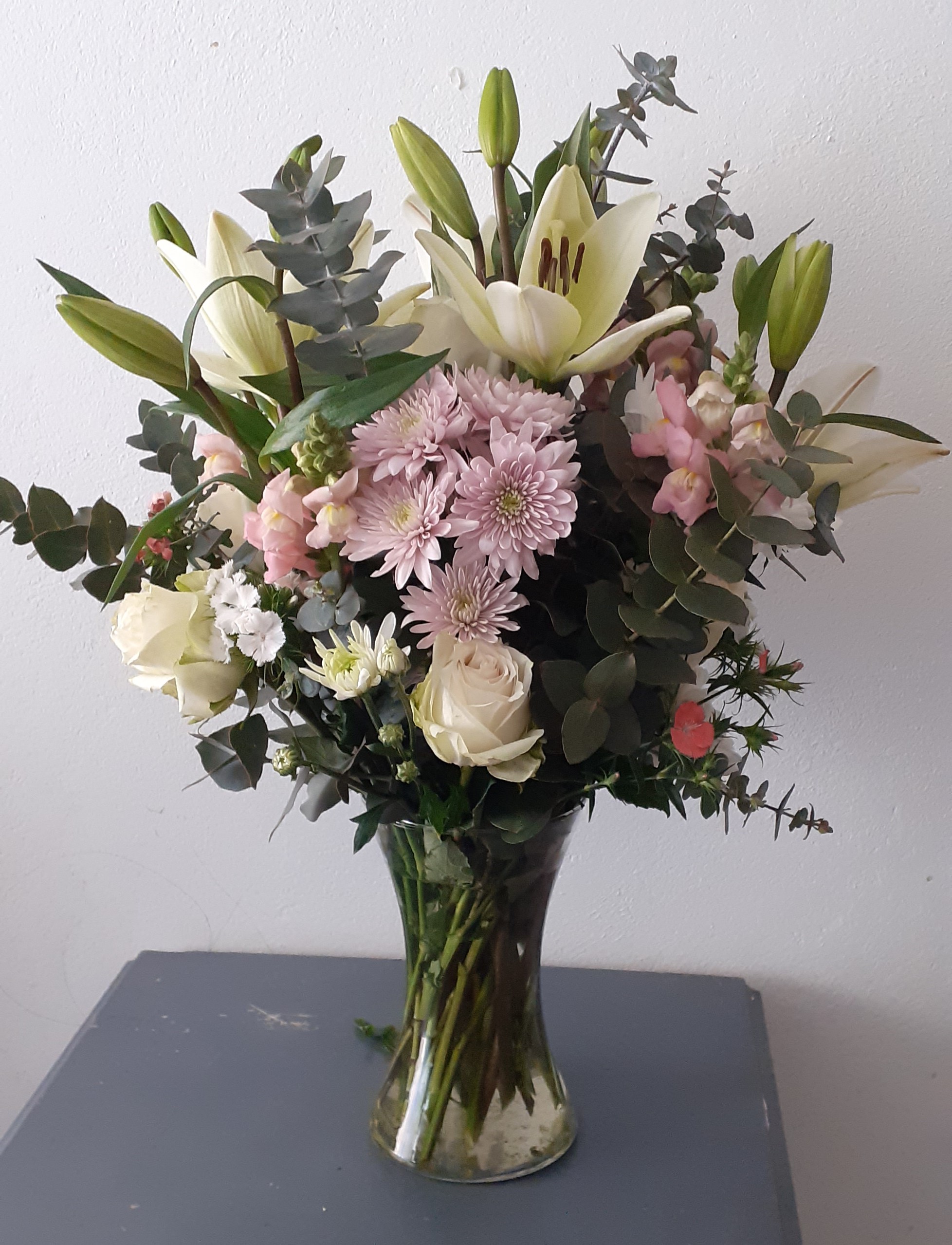 This Elegant vase features a beautiful mix of lilies, chrysanthemums, soft pink snapdragons, white roses, and fresh pennygum. This simple and graceful arrangement adds a peaceful touch to any room, making it perfect as a gift or a centerpiece. Perfect for bringing tranquility and natural beauty to your home or as a thoughtful gift for someone special.