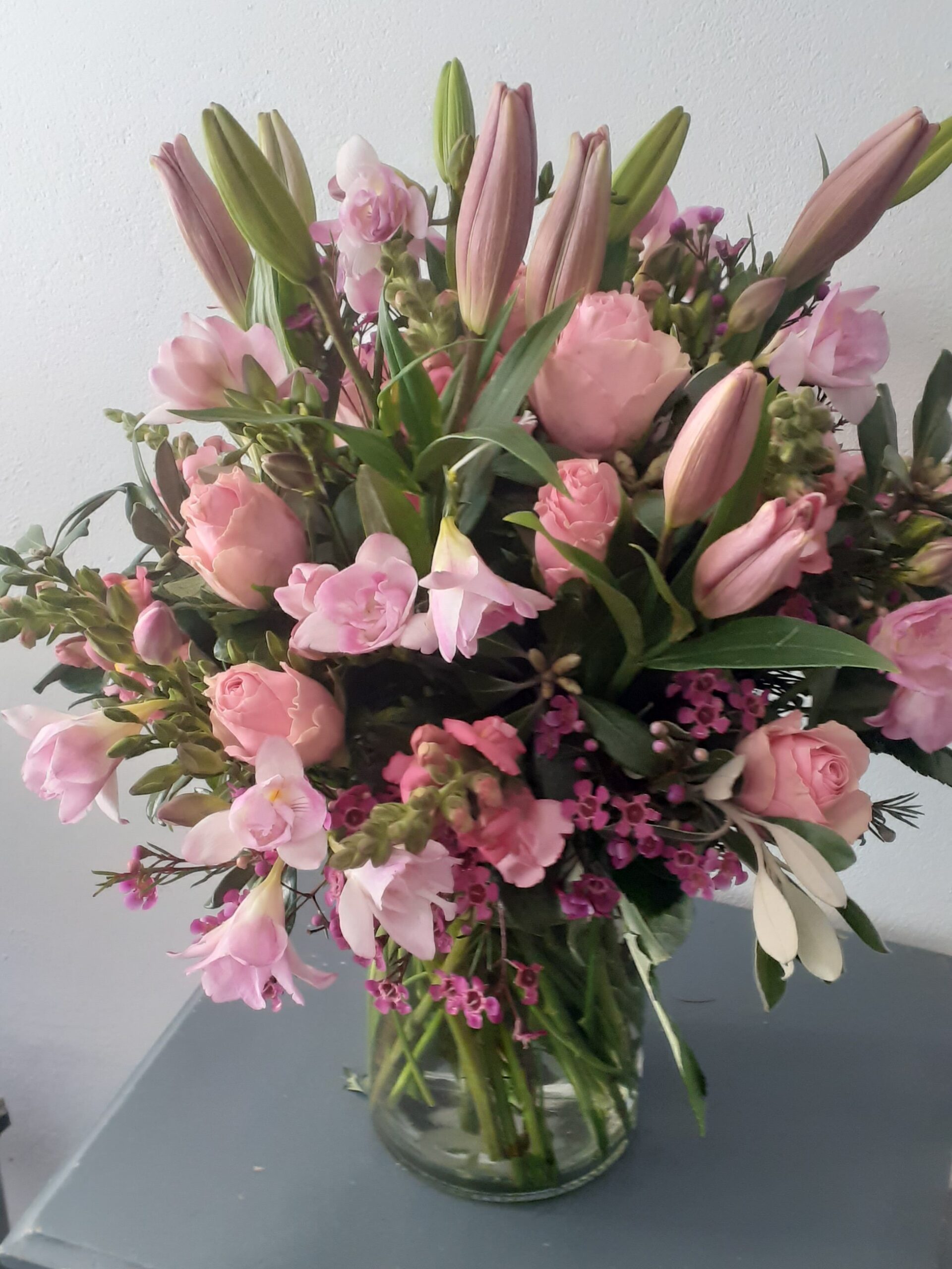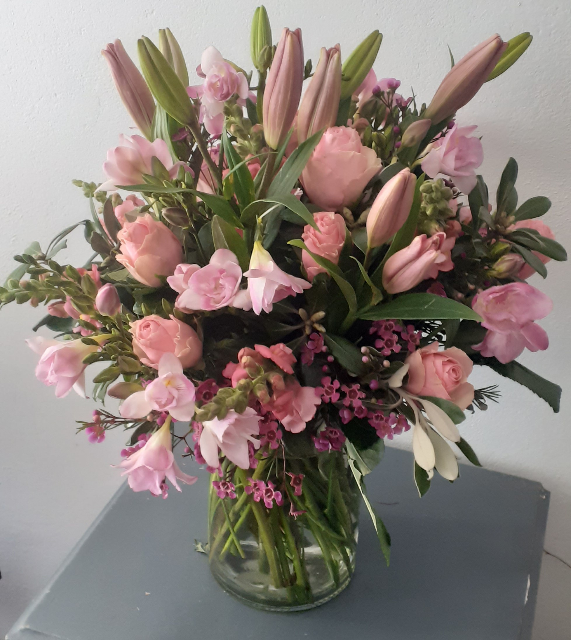 Celebrate elegance with our Pink Symphony Bloom, a breathtaking arrangement featuring the serene beauty of lilies, the striking allure of stargazers, and the delicate charm of pink roses. Enhanced by vibrant snapdragons and gracefully arranged in a chic vase, this design brings a touch of sophistication and warmth to any occasion.